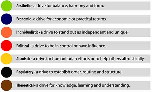 The Online Motivators Assessment is based on the research of Dr. Eduard Spranger and Gordon Allport and their study of human value, motivation and drive. It is also known as the Motivational Style assessment tool and the Values (PIAV) Index. It helps people to better understand their unique value hierarchy or belief system pertaining to what motivated them, what they are most drawn to and where their passions lie. The seven dimensions of values they discovered help us better understand the reasons that drive an individual to utilize their talents in the unique way they do.