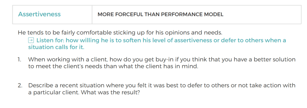 Below is an example of a candidate, Oliver, whose assessment results indicated they were outside the required range for the Assertiveness personality trait. You can see how these types of questions allow you to get a sense of whether a candidate is able to stretch their behaviors to meet the needs of a particular role or task.